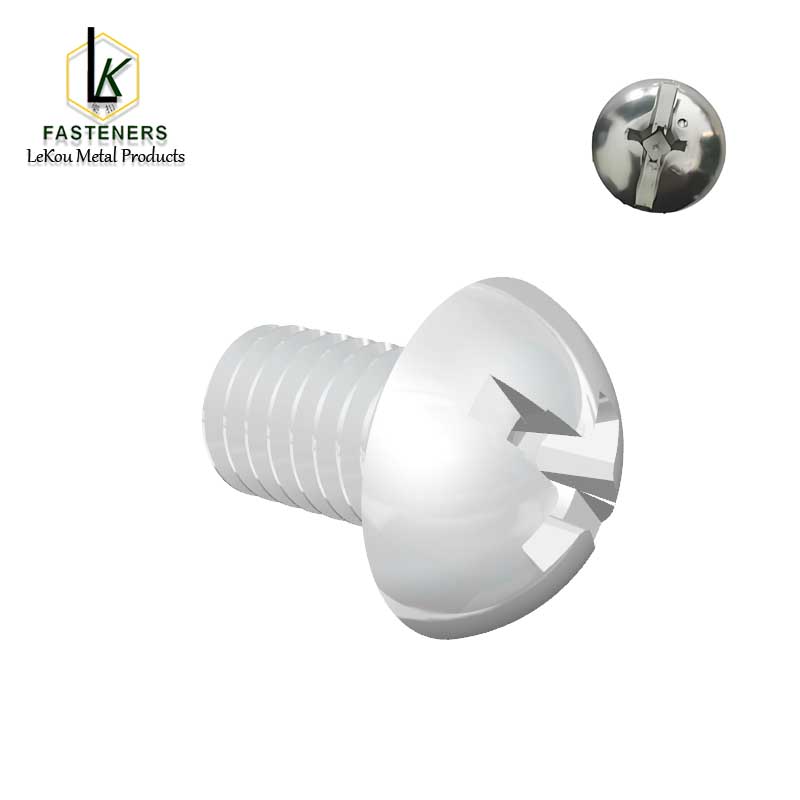 Шрубы з круглай галоўкай з кампазітнай канаўкай (Phillips+ шлиц+квадрат) складаюцца з круглай галоўкі, кампазітных прывадных канавак і зубцоў машыны. Яны маюць рознанакіраваныя кропкі зачаплення, сумяшчальныя з трыма тыпамі універсальных біт і маюць сферычную дугападобную кантактную паверхню. Яны могуць быць зубчастымі або беззубчастымі пад галоўкай, павялічваючы плошчу кантакту, рассейваючы павярхоўны ціск і прадухіляючы парэпанне і дэфармацыю тонкіх і далікатных матэрыялаў. Яны балансуюць знешні выгляд і абарону, з зубчастым тыпам, які ўзмацняе прадухіленне восевага расхіствання. Іх асноўная функцыя - канструкцыя з трыма канаўкамі для зручнага выкарыстання з рознымі бітамі. Аднак важна адзначыць, што пры выкарыстанні кожнай біты паасобку крутоўны момант прываднай канаўкі будзе менш фактычнага крутоўнага моманту. Пры выкарыстанні кампазітнай біты крутоўны момант канаўкі на самай справе будзе большым, чым фактычны крутоўны момант.