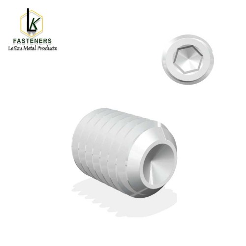 Шрубы з унутранай галоўкай з унутраным ключом з нержавеючай сталі з паглыбленымі канцамі складаюцца з шрубы з унутранай галоўкай без галоўкі з поўнай разьбой на адным канцы і паглыбленай канічнай паверхні пад вуглом 118 градусаў ± 5 градусаў на другім канцы. Паглыблены канец выкарыстоўваецца для ўціскання ў нарыхтоўку з адукацыяй кальцавой паглыблення, якая забяспечвае абарону ад расхіствання, устойлівасць да вібрацыі і высокую дакладнасць пазіцыянавання. Яго ўстойлівасць да вібрацыі пераўзыходзіць шрубы з плоскім/канічным канцом, што робіць яго прыдатным для прымянення, якое патрабуе сур'ёзных мер супраць расхіствання і рэдкай разборкі. Канструкцыя без галавы не выступае з паверхні нарыхтоўкі, што робіць яе прыдатнай для прымянення ў абмежаванай прасторы. Матэрыял з нержавеючай сталі таксама падыходзіць для выкарыстання ў вільготных і агрэсіўных асяроддзях. Аднак у параўнанні з усталявальнымі шрубамі з легаванай сталі ASTM F912 яго трываласць складае ўсяго 101,5 ksi або 116 ksi. Такім чынам, ён звычайна выкарыстоўваецца для фіксацыі і рэгулявання дакладных прыбораў, 3D-прынтараў і аўтаматызаванага абсталявання; стойкае да карозіі мацаванне ў суднабудаўнічым, хімічным і харчовым машынах; і схаваныя злучэнні ў электроніцы, мэблі і медыцынскіх прыборах.