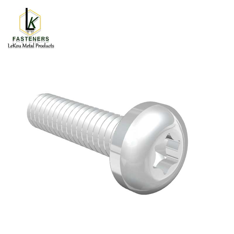 Шрубы з круглай галоўкай з нержавеючай сталі можна выкарыстоўваць у вільготных і хімічна агрэсіўных асяроддзях без іржы і карозіі. Гэтыя шрубы маюць плоскую галоўку ў форме дыска з прарэзам Torx або зоркай уверсе і вертыкальнымі або трапецападобнымі кантамі па баках. З-за вялікай плошчы кантакту шрубы torx з круглай галоўкай звычайна маюць больш высокую трываласць на расцяжэнне, што робіць іх прыдатнымі для аперацый з вялікім крутоўным момантам або кампанентаў, якія патрабуюць частай разборкі. У параўнанні з традыцыйнымі крыжовымі шрубамі або шрубамі, такая канструкцыя павялічвае плошчу кантакту паміж інструментам і шрубай, тым самым зніжаючы рызыку слізгацення падчас закручвання і павышаючы эфектыўнасць і бяспеку працы. Памеры прарэзаў torx вар'іруюцца ад Torx5 да Torx55 у залежнасці ад дыяметра, ад 0# да 1/2". Такім чынам, для закручвання патрабуецца адпаведны гаечны ключ torx. Машынныя шрубы могуць вырабляцца любой даўжыні, але яны звычайна вырабляюцца з дробным крокам даўжыні ў 1/16 цалі для шруб даўжынёй да 5/8 цалі, 1/8 цалі для шруб больш за 5/8 цалі да 1-1/2 цалі ў даўжыню і 1/4 цалі для шруб больш за 1-1/2 цалі ў даўжыню